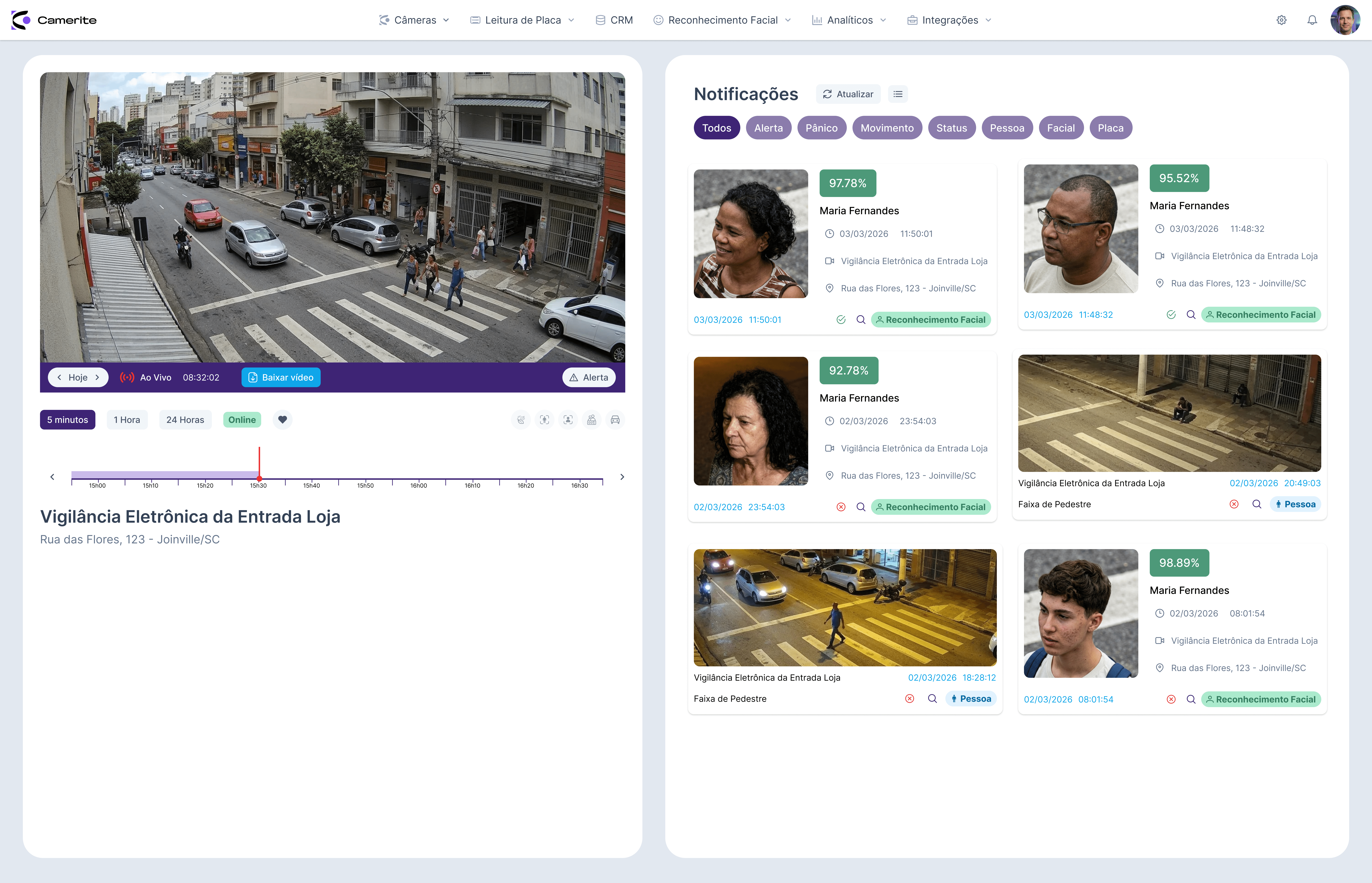 Tecnologia de ponta para autorizar acessos, encontrar pessoas desaparecidas e identificar suspeitos com alertas automáticos. A IA da Camerite detecta e reconhece rostos nas suas câmeras, registrando cada ocorrência na plataforma.